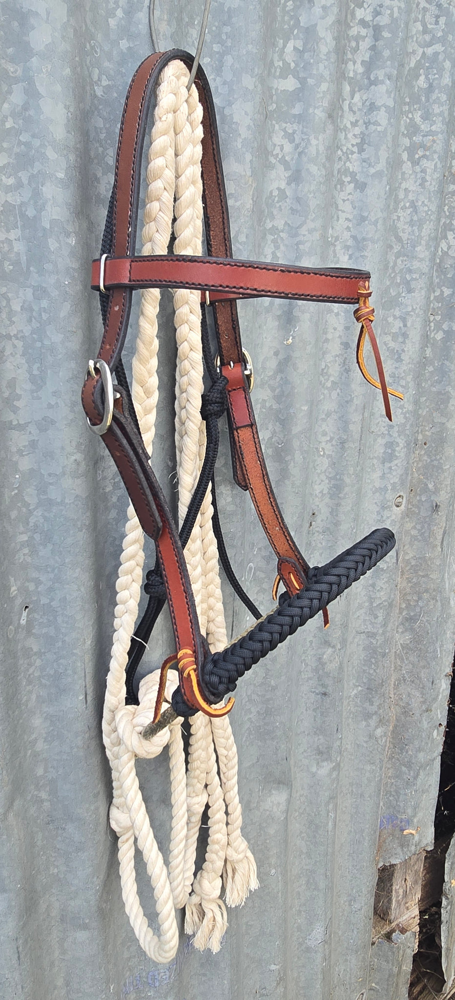 The headstall is a Dark Oil Herman Oak with a 16 1/4 inch browband and is completely hand stitched edges and a black 6.35mm rope adjustable fiador. The noseband is 28 inches in circumference and is braided over in a black. The cotton training reins are 6 ft long and are approximately 3/4 inch wide. These have a great feel and weight to them.