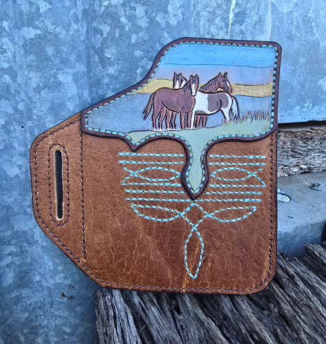 Western Style Belt Phone Pouch - Wild Horses and Boot Stitch