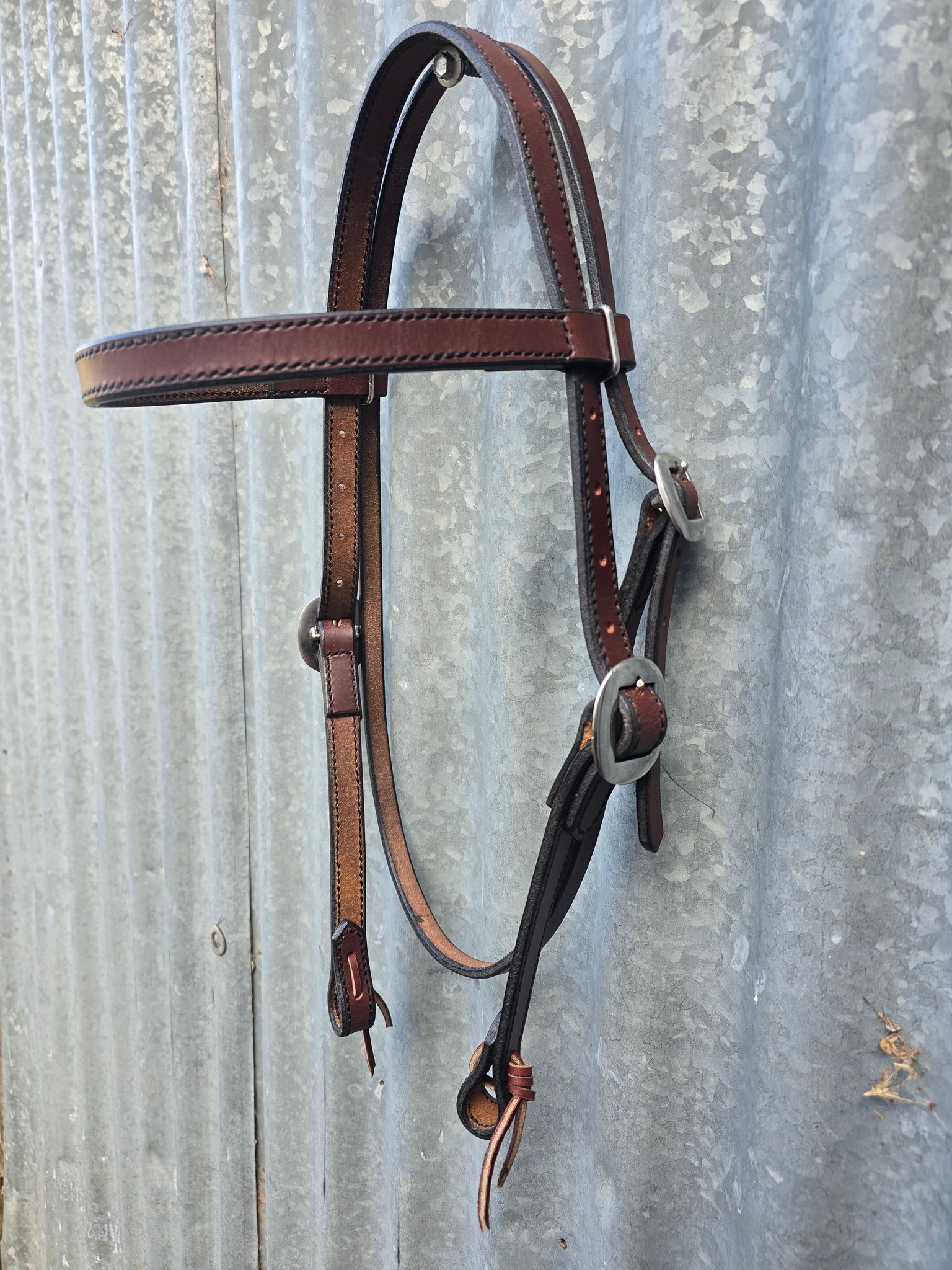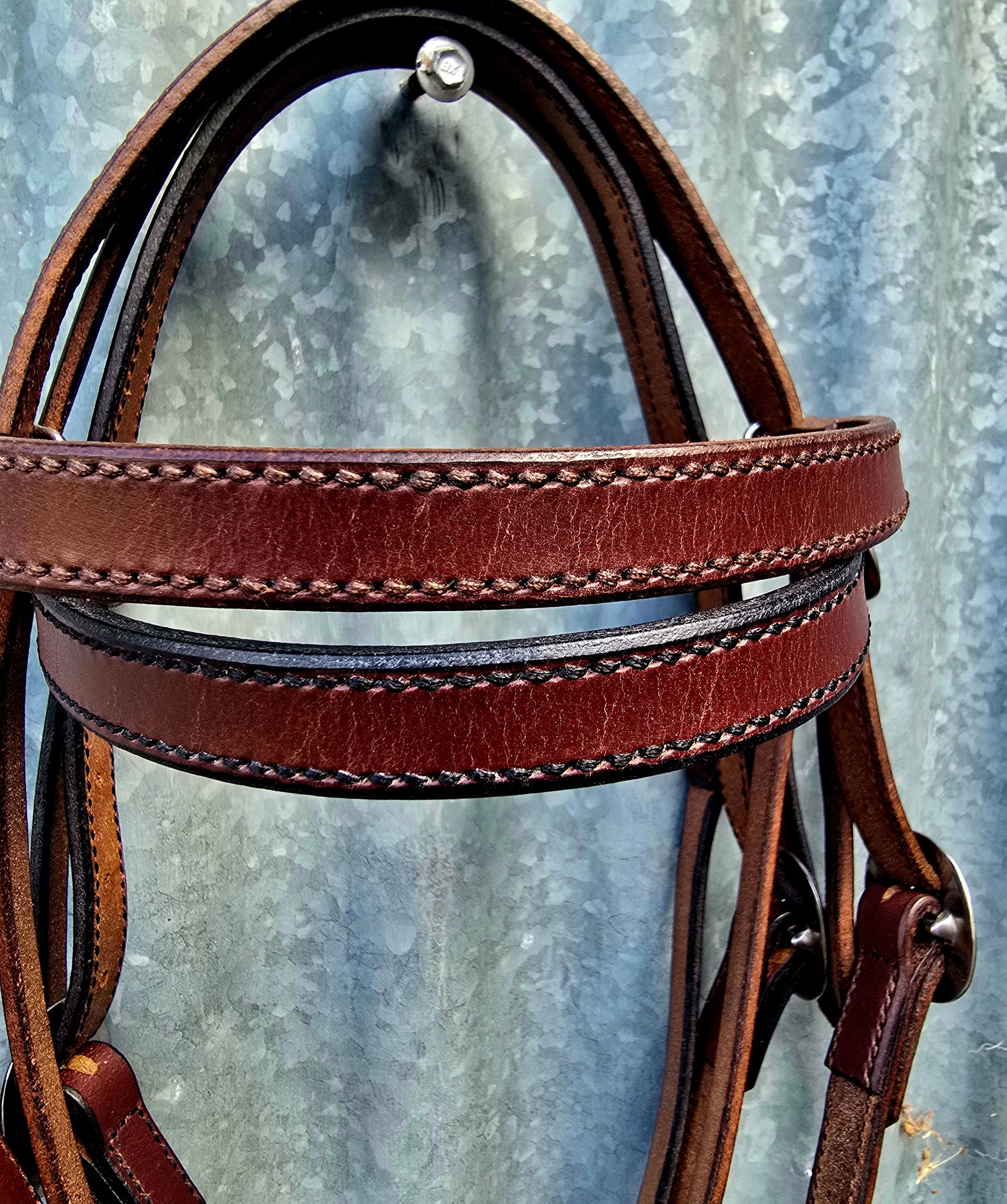 Beautiful bridle leather headstalls with Stainless Steel or Brass Buckles. Choose 1 of 3 different colour combos in cob or full size.