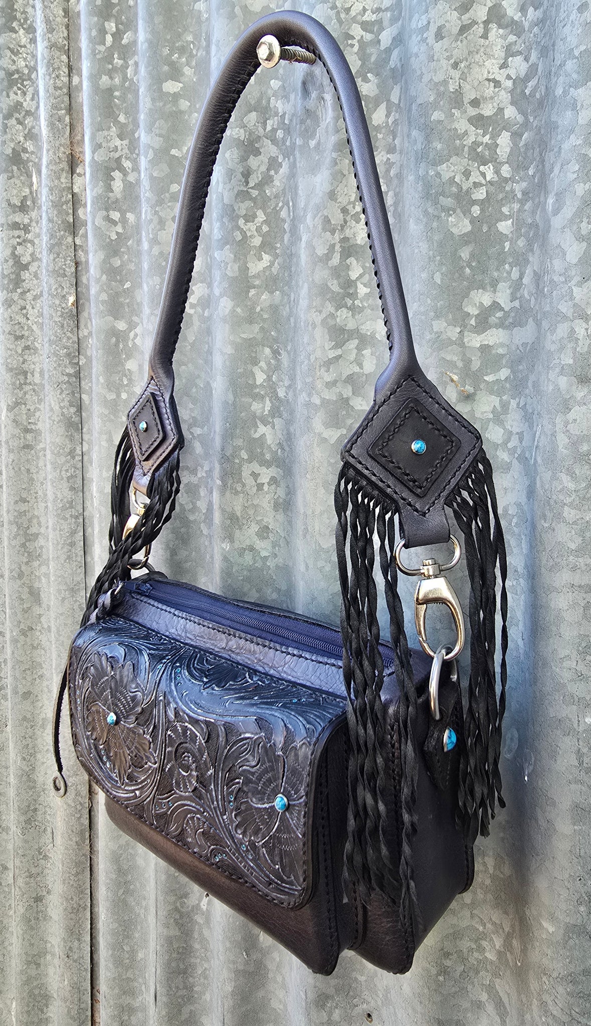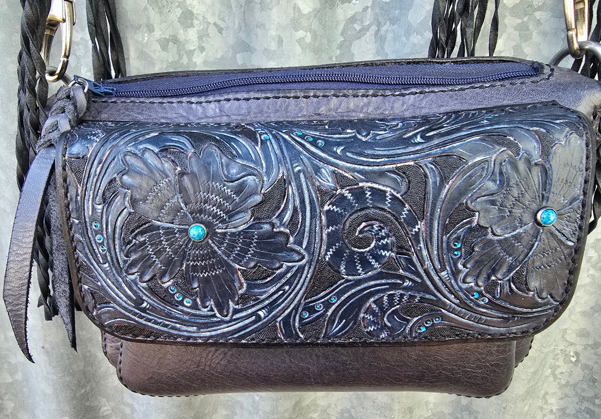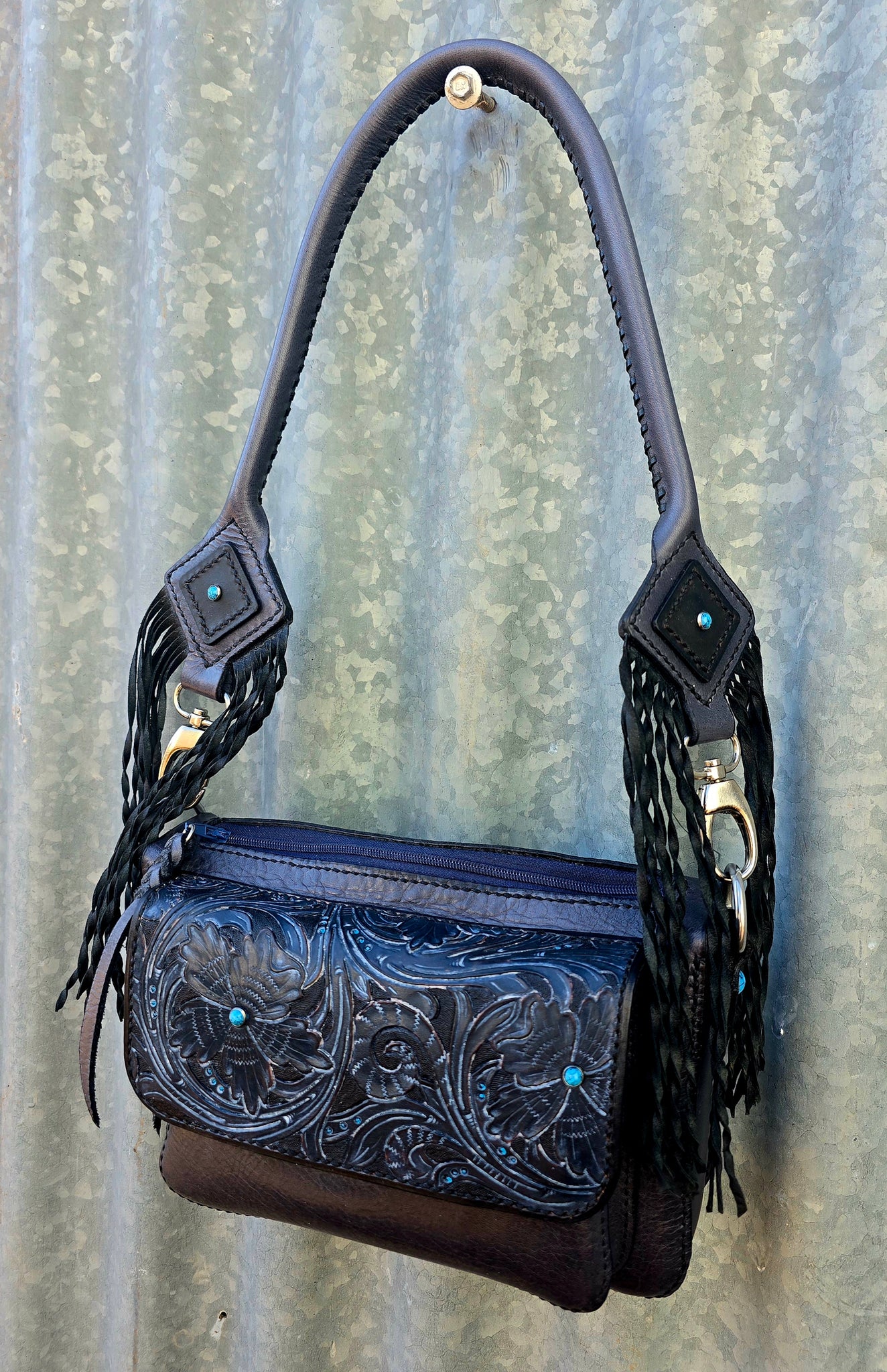 A Unique and beautiful western style handmade leather bag with tooling, fringe and turquoise studded accents.