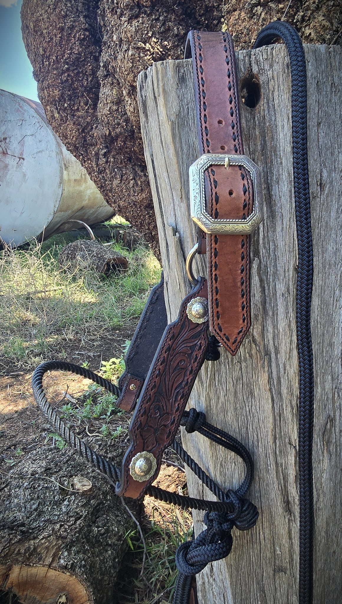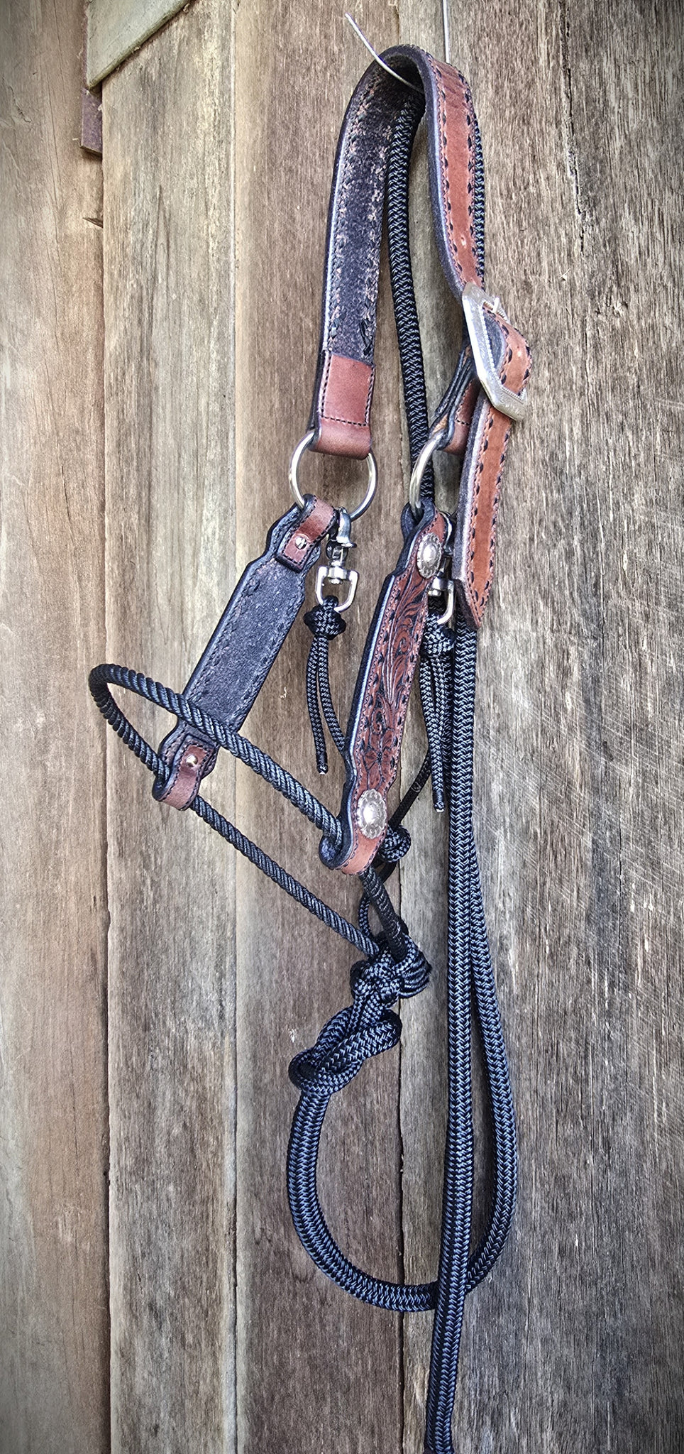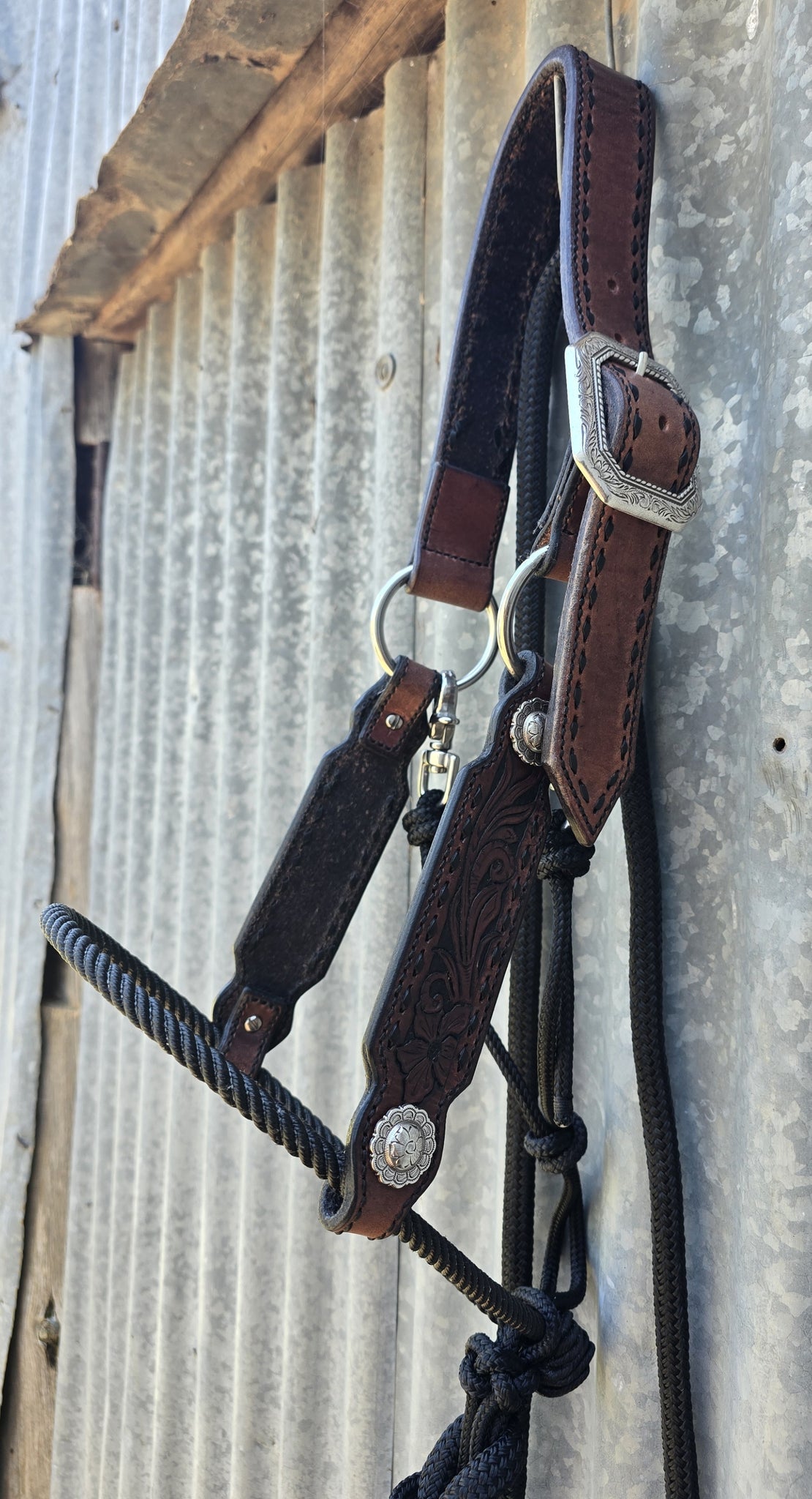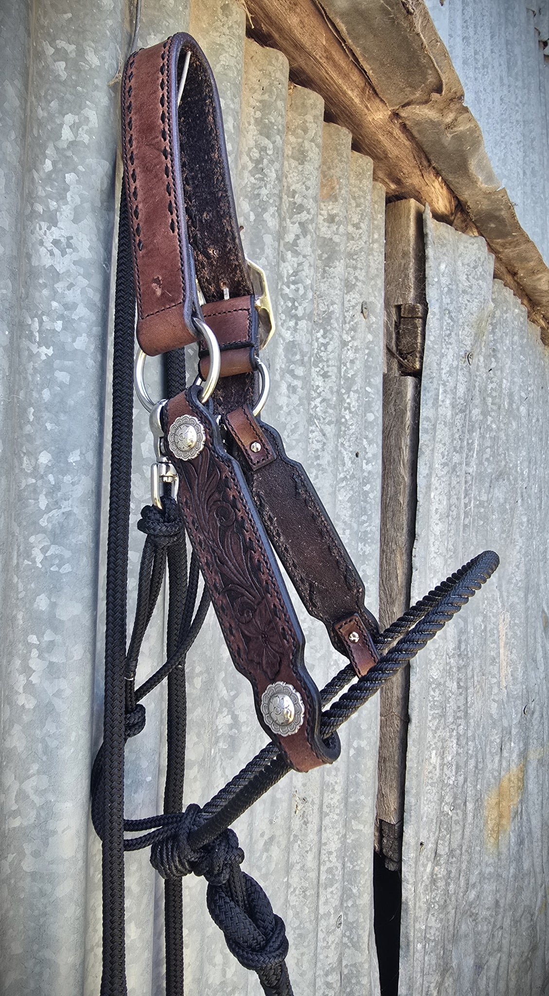 Dark mahogany Herman Oak leather with fully tooled floral cheeks and dark brown buck stitching teamed up with a black lariat noseband, black 6mm rope for the gullet and throatlatch (which is adjustable) and a 12mm 6ft black lead and leather popper.