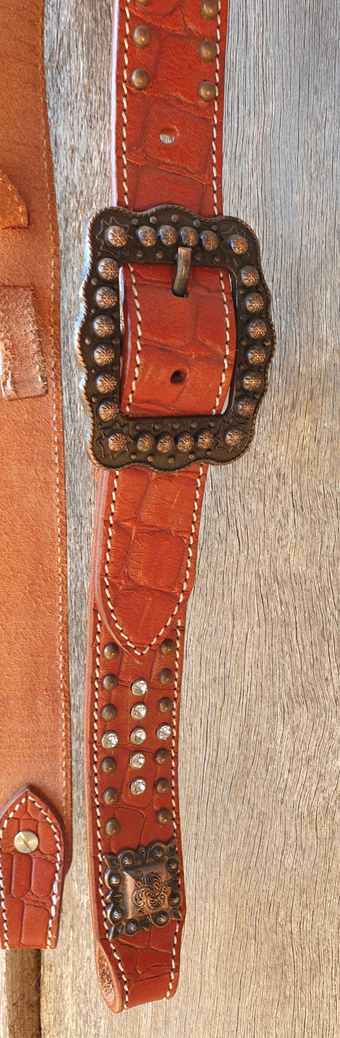 Mid tan moc croc leather belt style headstall with copper buckles, conchos and crystal rivets.